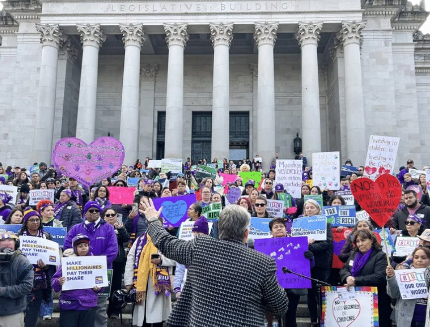 Hundreds of union members, educators and caregivers rallied on the steps of the state Capitol on Tuesday, urging lawmakers to tax the state’s wealthiest residents and warning that schools and public services could face deep cuts without new revenue.